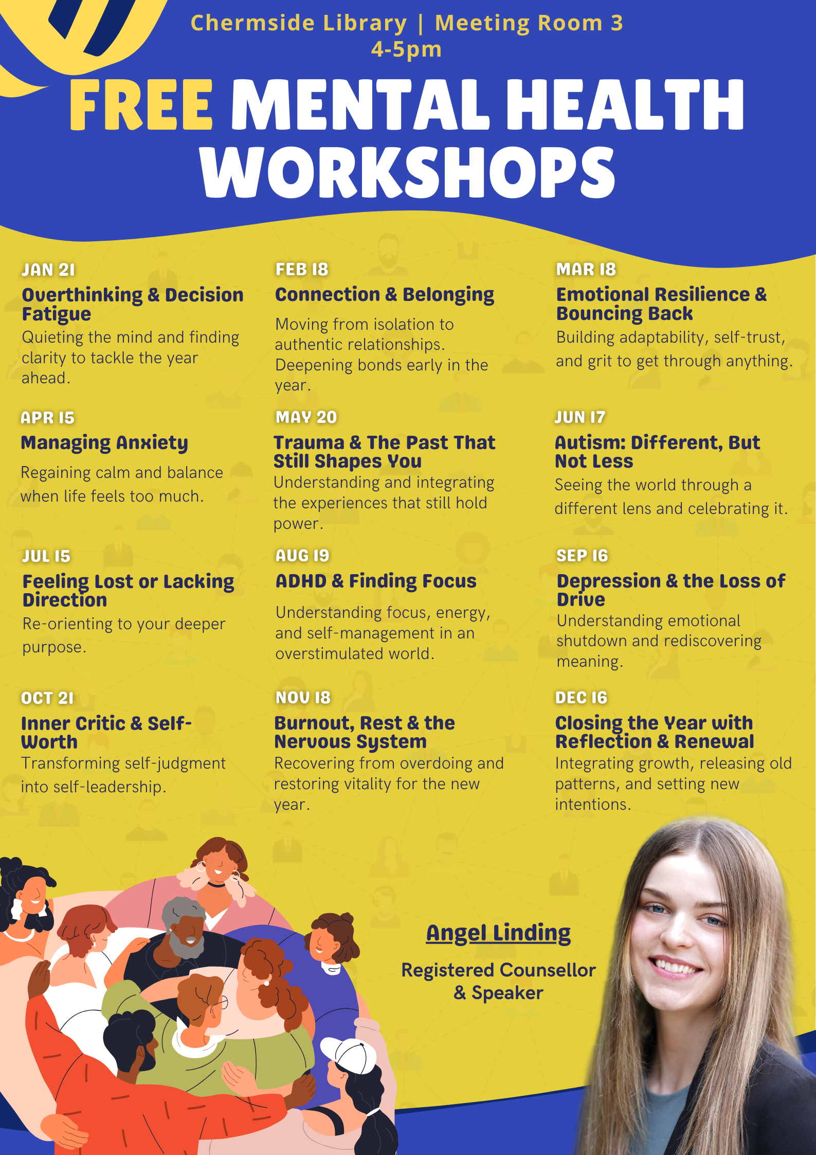 Angel regularly facilitates workshops, public talks, and community events designed to make psychological insight accessible and practical.